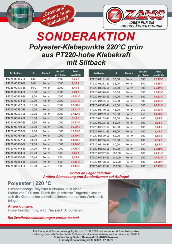 Sonderaktion Polyester-Klebepunkte 220 °C grün aus PT220 hohe Klebekraft mit Slitback Die Sonderaktion ist gültig bis zum 31.12.2026 Download